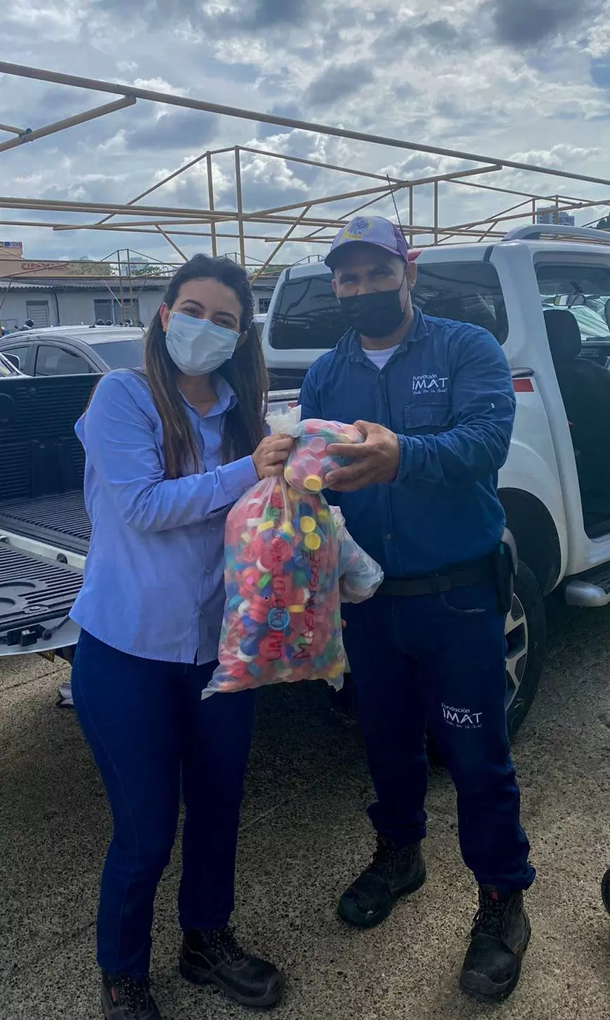 En la primera entrega la empresa aportó a la Fundación IMAT, 261.3 kilogramos de papel y 5,3 Kilos de Tapitas plásticas de distintos colores de envases de gaseosa, aceite, desinfectante, blanqueador, suavizante, medicamentos, entre otros.